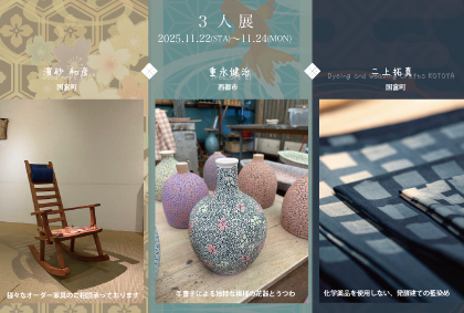 木工・陶器・藍染 3人展 来たる2025年11月22日(土)から11月24日(月)に3人展を開くことになりました。毎年恒例の2人展(木屋工房、free art EI)に加え、国富町の藍染 こと屋の3人。是非、この機会にたくさんのご来場をお待ちしております。 お知らせ一覧 << 前の記事